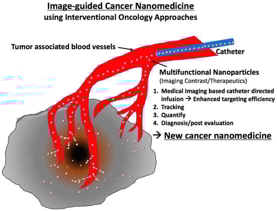 However, big challenges of those nanoparticles for nanomedicine applications has been issued during recent in vivo and clinical translations []. In 2016, Wilhelm et al. [] reviewed the literature from the past 10 years on nanoparticles-based nanomedicine; they reported that only 0.7% [median] of the administered nanoparticle dose was delivered to a solid tumor. The enhanced permeability and retention (EPR) effect and active targeting using tumor specific molecules are regarded as promising approaches for the tumor targeting, but RES sequestration, tumor-intrinsic barriers and tumor heterogeneity resulted in extremely low tumor targeting and tumor uptake efficiency [,,]. This low targeting efficiency negatively affects the translation of nanomedicine to clinical applications. Hence, current future cancer nanomedicine strongly requires more localized and personalized approaches considering the tumor heterogeneity. More efforts for in-depth understanding of nanoparticles and tumor interactions are needed []. Eventually, nanomedicine approaches should be tailored and personalized based on medical diagnosis and imaging. Medical image-guided interventional oncology approaches should be one of the promising solutions for current nanomedicine.