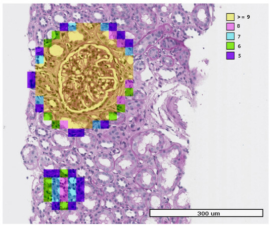 Besides, we can observe in the results shown in Figure 10, the block effect that appears in the detected Glomerulus regions. This block effect appears because of the overlapping between sliding windows, which we established at 80% of the window size (227 × 227 pixels) in horizontal and vertical axis. Therefore, the tissue area is divided in regions of 45 × 45 pixels (remainder 20%) that share the same 10 windows. Since we are using redundancy where only pixels belonging to regions with nine or higher out of 10 positive classifications are classified as Glomerulus region, we obtain this block effect of 45 × 45 pixels between: