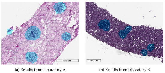 Results obtained in two WSI (Whole Slide Images) created in different laboratories. Regions detected as Glomerulus appear in blue color.