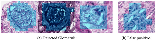 Example of correct and false positive detections. Regions detected as Glomerulus appear in blue color.