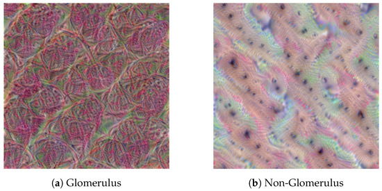Besides, one the most outstanding methods for CNNs interpretation has been used to get an idea of the concept of glomerulus and non-glomerulus that these models have. This is the Deep Dream image generation, which is able to build artificial images that performs maximum activation on a given channel. When it is applied to a classification layer, it is possible to observe the ideal representation of the different classes that the model has been trained to discern. Figure 13 shows the results obtained in the pretrained AlexNet model for Glomerulus and Non-Glomerlus class. It is stated that the model has learned the typical structure of the glomeruli, their outer shape and internal components. However, the Non-Glomerulus representation shows an undefined structure with dots related to typical individual cells.