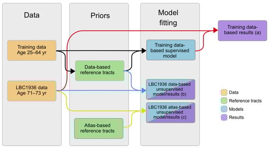 We therefore obtained three PNT models per tract of interest: (a) a matching model from the training dataset and the data-based reference tract; (b) a matching model from the LBC1936 dataset and the data-based reference tract; and (c) a matching model from the LBC1936 dataset and the atlas-based reference tract. These three cases are represented by the black, blue and yellow paths, respectively, in the flow chart in Figure 1.