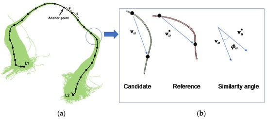 Graphical representation of a candidate tract (a), the median line is fitted to a B-spline with knot points separated by a distance d (straight-line distance). A B-spline representation is also used for the reference tract. The vector between two consecutive knot points in the candidate and the equivalent knot points in the reference can be compared and the angular deviations obtained. (b) illustrates the shape model used by probabilistic neighborhood tractography (PNT), based on angular deviations , between equivalent tract segments in the reference and candidate tracts, and , respectively. The putative direction of each segment is always away from the anchor point. Adapted from [,].