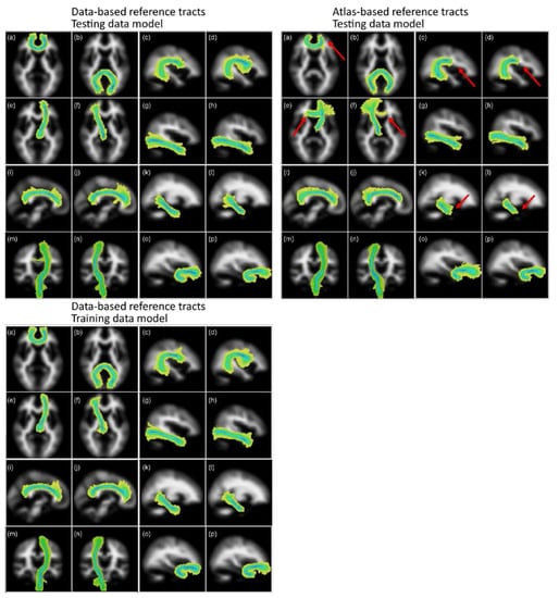 The unsupervised fitting process was also repeated using the reference tracts, previously created from an atlas [,], which are currently provided with the TractoR package. This allows for the new data-based reference tracts to be compared with the previous atlas-based reference tracts.