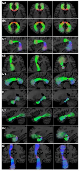 - Armitage, P.A.; Muñoz Maniega, S.; Bridson, J.; Poon, M.; Bastin, M.E. Improved white matter tract segmentation reproducibility using global diffusion tensor neighborhood tractography. In Proceedings of the ISMRM 20th Annual Meeting & Exhibition, Melbourne, Australia, 5–11 May 2012; p. 1905. [Google Scholar]
