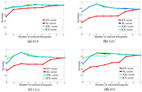 Each row of this table shows the histogram ranking in the considered color space using the specified histogram selection score, for the three image sets. For example the first row shows that, in the RGB color space, using the -score and the OuTex database, the first selected histogram is the number 2 (), followed by the histogram 4 (), ... and finally the histogram 9 () is the last selected. The bold values correspond to the selected histogram subspace for which the best accuracy is achieved for each of the three color texture sets.