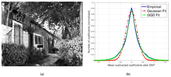 (a) JP2K compressed image and (b) its histogram of divisively normalized bandpass coefficients. The difference between the best generalized Gaussian distribution (GGD) and Gaussian fits indicates that the generalized Gaussian-based contrast estimator is more appropriate for distorted coefficients. The computed Kullback–Leibler divergence values of the Gaussian and GGD fits were found to be KLD and KLD, respectively.