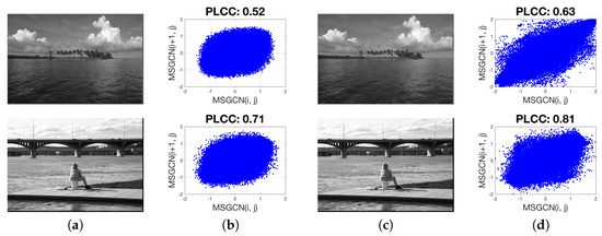 (a) Reference images from the LIVE database [40], (b) Scatter plot of adjacent pristine MSGCN coefficients, (c) JP2K compressed images and (d) Scatter plot of adjacent distorted MSGCN coefficients. The figure illustrates the dependency of horizontally adjacent mean subtracted generalized contrast normalized (MSGCN) coefficients of exemplar pristine images. The degree of these dependencies increases with the distortion severity. The PLCC (Pearson’s linear correlation coefficient) is used as a dependency measure.