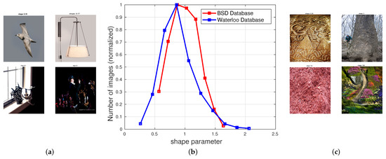 We next analyze how the shape parameter of the MVGG distribution varies when modeling the joint distribution of adjacent MSGCN coefficients of natural, photographic images from two widely used databases: the Waterloo exploration database [47] and the Berkeley Segmentation Database (BSD) [48]. The Waterloo exploration IQA database contains 4744 pristine natural images reflecting a great diversity of real-world content. The Berkeley Segmentation Database was designed to support research on image segmentation and contains 300 training images and 200 test images. In our analysis, we only used ostensibly pristine images to generate MSGCN response maps, toward modeling a five-dimensional joint empirical distribution of neighboring MSGCN coefficients using an MVGG density. Figure 4b plots a histogram of the estimated shape parameter values of the MVGG model. The shape parameter peaked at around the same value () on both databases, suggesting that the joint distribution of MSGCN coefficients of the pristine images may be reliably modeled as a multivariate Gaussian. This outcome may be viewed as a multivariate extension of the well-established Gaussian property of univariate normalized bandpass coefficients [18,24,25,26]. There are, however, a few samples within the studied collection of natural images where the estimated shape parameter deviated from . For example, a few images from the Waterloo exploration database, e.g., those shown in Figure 4a, contain predominantly flat, highly correlated regions that yielded peakier MVGG fits where . Cloudless sky regions (upper left of Figure 4a) are bereft of any objects and cause this effect. The lower two images of Figure 4a have large saturated over/under-exposed areas and may be viewed as substantially distorted. Overall, undistorted non-sky images of this type are rare. Conversely, the images shown in Figure 4c are each almost entirely comprised of heavily textured regions, with less peaky fits (). These kinds of images are also unusual.
