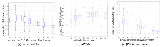 Boxplots of the estimated shape parameter s for three different distortions: (a) Gaussian blur, (b) AWGN and (c) JPEG compression (MATLAB’s imwrite function is used to control the degree of JPEG compression by specifying ‘quality’ as the argument in the imwrite function). Outliers were removed from the plots for better visualization.