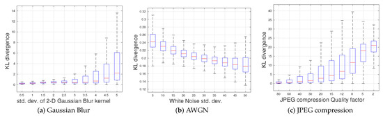 Boxplots of the KL divergence between the 2D empirical distributions of MSGCN coefficients and their multivariate Gaussian fits for three different distortions: (a) Gaussian blur, (b) AWGN and (c) JPEG compression. Outliers were removed from the plots for better visualization.
