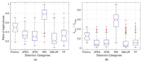 As shown in Figure 2, even after the application of the GCN transform, the MSGCN responses remain correlated on images degraded by correlation-inducing distortions such as compression and blur. Such distortions lead to more polarized eigenvalues of the estimated covariance matrix than do other distortions (AWGN). In order to demonstrate the effect of distortions on the eigenvalues, we use the ratio of the minimum and maximum eigenvalues () of the estimated scale matrix from the best 2D MVGG fit to the vertically adjacent MSGCN coefficients. We also fit a 5D MVGG to the five neighboring coefficients (as shown in Figure 3). Figure 7 shows the boxplots of the ratio over all images from the LIVE database [40], but classified by distortion type. The pattern of variation of the eigenvalues of the estimated covariance matrix in the presence of different distortion types is indicative of the rich perceptual quality information captured by eigenvalues.