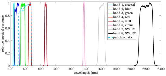 We generate three multiband images (panchromatic, multispectral, and hyperspectral) using each reference image. We obtain the hyperspectral images by applying a rotationally-symmetric 2D Gaussian blur filter with a kernel size of and a standard deviation of to each reference image followed by downsampling with a ratio of in both spatial dimensions for all bands. For the multispectral images, we use a Gaussian blur filter with a kernel size of and a standard deviation of and downsampling with a ratio of in both spatial dimensions for all bands of each reference image. Afterwards, we downgrade the resultant images spectrally by applying the spectral responses of the Landsat 8 multispectral sensor. This sensor has eight multispectral bands and one panchromatic band. Figure 1 depicts the spectral responses of all the bands of this sensor [73]. We create the panchromatic images from the reference images using the panchromatic band of the Landsat 8 sensor without applying any spatial blurring or downsampling. We add zero-mean Gaussian white noise to each band of the produced multiband images such that the band-specific signal-to-noise ratio (SNR) is dB for the multispectral and hyperspectral images and dB for the panchromatic image. In practice, SNR may vary along the bands of a multiband sensor and the noise may be non-zero-mean or non-Gaussian. Our use of the same SNR for all bands and zero-mean Gaussian noise is a simplification adopted for the purpose of evaluating the proposed algorithm and comparing it with the considered benchmarks.