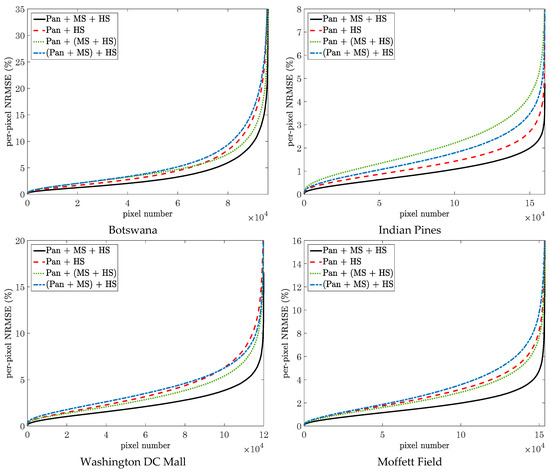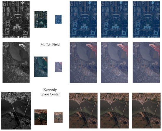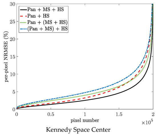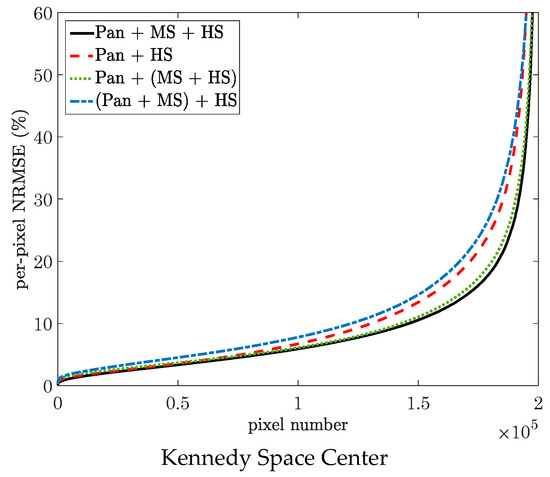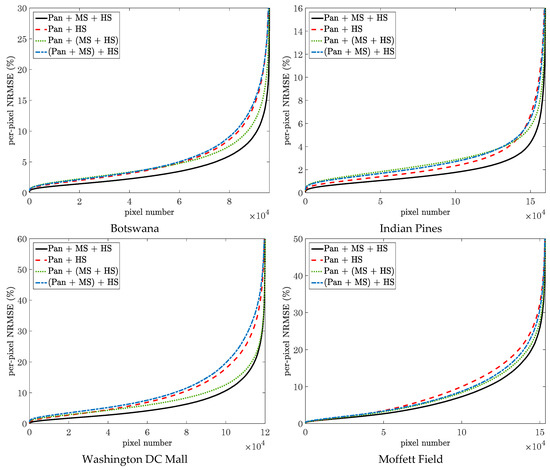 To the best of our knowledge, all existing multiband image fusion algorithms are designed to fuse a pair of multiband images with complementary spatial and spectral resolutions. Therefore, fusing more than two multiband images using the existing algorithms can only be realized by performing a hierarchical procedure that combines multiple fusion processes possibly implemented via different algorithms as, for example, in [53,54]. In addition, there are potentially various ways to arrange the pairings and often it is not possible to know beforehand which way will provide the best overall fusion result. For instance, in order to fuse a panchromatic, a multispectral, and a hyperspectral image of a scene, one can first fuse the panchromatic and multispectral images, then fuse the resultant pansharpened multispectral image with the hyperspectral image. Another way would be to first fuse the multispectral and hyperspectral images, then pansharpen the resultant hyperspectral image with the panchromatic image. Apart from the said ambiguity of choice, such combined pair-wise fusions can be slow and inaccurate since they may require several runs of different algorithms and may suffer from propagation and accumulation of errors. Therefore, the increasing availability of multiband images with complementary characteristics captured by modern spectral imaging devices has brought about the demand for efficient and accurate fusion techniques that can handle multiple multiband images simultaneously.