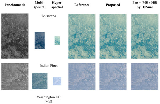 The panchromatic, multispectral, and hyperspectral images that are fused together, the reference hyperspectral image, and the fused images produced by the proposed algorithm and the Pan + (MS + HS) method using the HySure algorithm.