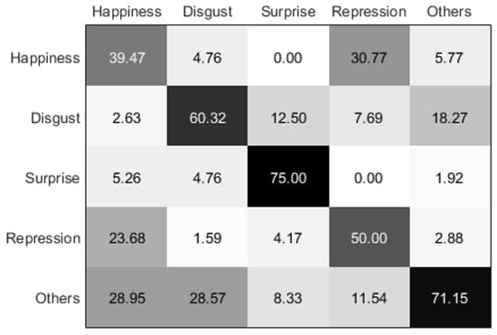 Evidence to support the proposed AU-based categories can be seen in the confusion matrix in Figure 3. A high proportion of micro-expressions have been classified as ‘others’, for example 28.95% of the ‘happiness’ and 28.57% of the ‘disgust’ categories are classified as ‘others’ respectively. The original chosen emotions, including many placed in the ‘others’ category, leads to a lot of conflict at the recognition stage. It should be noted that the CASME II dataset [23] included self-reporting, which adds another layer of complexity during classification.