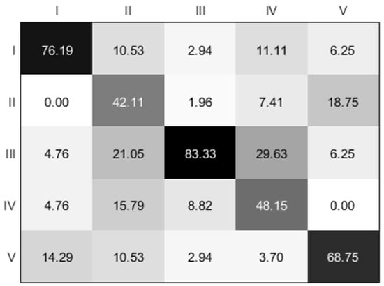 Confusion matrix of the proposed classes I–V on the CASME II dataset using the LBP-TOP feature and SMO as a classifier.