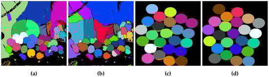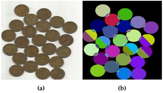 For natural images, this approach may give a better segmentation result, but if you segment contiguous objects with a similar size, the result may be worse than when using the distance transform. These advantages and disadvantages are due to the fact that the result depends on the color difference of the segmented objects. Furthermore, noise and minor color fluctuations significantly affect it. As an example, in Figure 3, you can see the segmentation results of such images by the OpenCV and Skimage implementations. Furthermore, this approach allows you to apply a watershed segmentation directly to a color image and get a higher resolution when segmenting color images than using a morphological gradient [51,52]. However, a better segmentation result could be obtained by using a uniform color metric [53].
