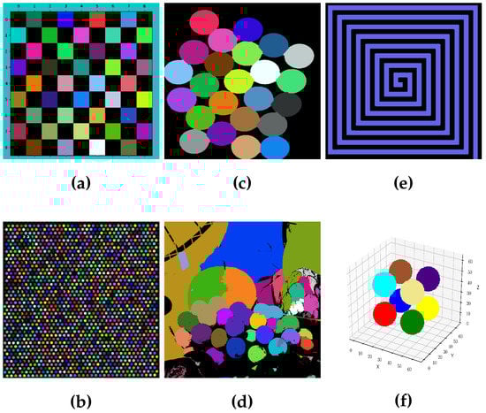 Segmentation result: (a) board; (b) cells; (c) coins; (d) fruits; (e) maze; (f) balls.