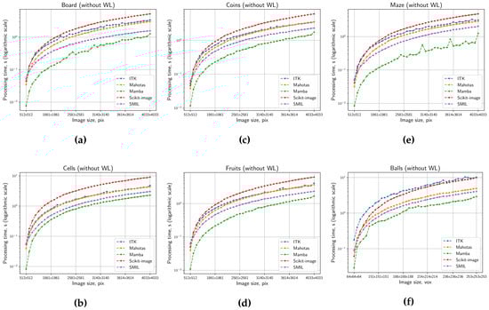 We measured the expended computing resources of segmentation, depending on the image size for a series of 2D images (board, cells, coins, fruits, maze) and the generated 3D image (balls), shown in Figure 4. These samples contain the following: images of objects with similar sizes, both with a relatively small number of objects (board, coins, balls) and with a relatively large one (cells); a natural image (fruits); and an artificial image with a snake-like structure (maze).