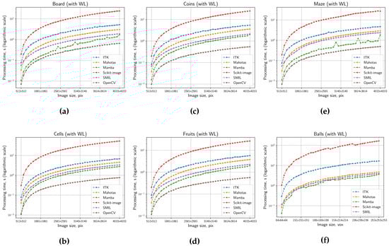 The each segmentation result of the initial size images is shown in Figure 5. On the basis of the experimental data, we plotted the dependence of the execution time on the images size: Figure 6 for images without the construction of WL and Figure 7 with it.