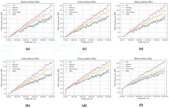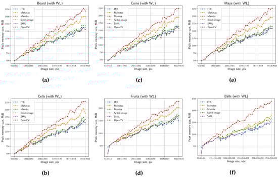 In addition, we measured the peak memory volume used by each implementation. The corresponding graphs are presented in Figure 8 for images without the construction of WL and Figure 9 with the construction. We can see from these graphs that the implementations of all libraries, with the exception of Skimage, Mahotas for the 2D case and Skimage for the 3D case, use a similar peak memory volume in both cases. Therefore, most of the implementations showed similar results with a difference of 2% for the 2D case and 7% for 3D. The only exception is the implementations that had larger peak memory consumption on average: Mahotas by 9% and Skimage by 18% for the 2D case; Skimage by 16% without construction of WL and 27% with construction of WL for the 3D case.