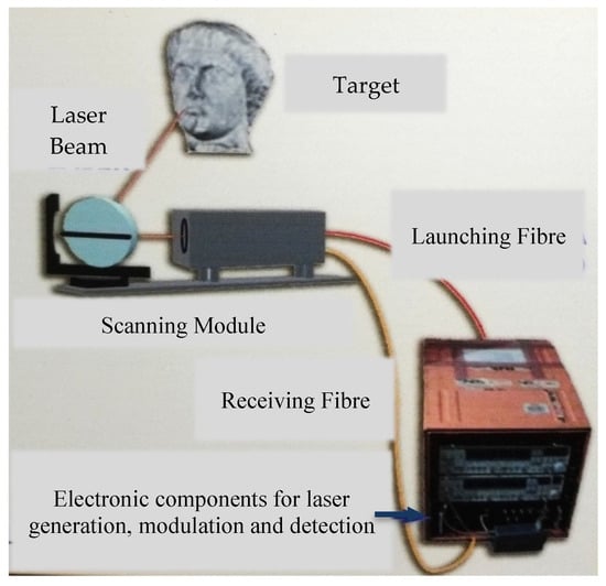 which depends on the laser optical frequency , the integration time , the detector’s quantum efficiency , the overall optics merit factor and the collected power P. Here, stands for the Planck constant. Efficient noise rejection is obtained by using narrow field-of-view, interferential filtering and low-noise detection electronics. Because of phase periodicity, the AM technique is affected by the so-called “folding” ambiguity: the system returns the same distance value for target points, of which relative separation along the line of sight is a multiple of half the modulation wavelength. In order to overcome this problem, the laser probe is modulated at two different frequencies with values taken far apart from each other. The lower modulation frequency is calculated by the corresponding measurement range encompassing the whole scene of interest. Low-frequency measurements are then used to remove the ambiguity that affects the corresponding high-frequency, employed for more accurate measures. By using this technique of double AM, it is possible to achieve sub-millimetric accuracy on targets at distances or heights from a few tenths up to 30–35 m, without the need of scaffolding [28,31]. The ITR hardware is composed of two physically separate modules but optically connected by means of optical fibers: the optical head and the electronic components. In particular, the scanning module, i.e., the optical head, of the two instruments basically includes the launching and receiving optics, and it consists of a lens system for the collimation and focalization of the lasers to the center of a double-motorized mirror. The latter sweeps the beam onto the target according to a TV raster-like positioning, differently from the rotative movement of commercial scanners, and collects the back-reflected beam. The returning signals are detected by low-noise photodiode detectors and analyzed by means of lock-in amplifier units, which are also used to modulate the laser sources. The data are processed with custom software through MATLAB® interface (see Section 2.3), and the resulting models and images can be exported into the most common file formats, thanks to the feature of the software. Figure 1 shows a schematic explanation of the ITR system operability.