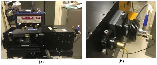 The modulation frequency in this case is 3 MHz and the principle of operation is the same as that of the RGB-ITR scanner. In this case, an IR detector (Licel APD Inasga, Figure 3b) is directly connected with the optical receiving channel and the lock-in amplifier. The Licel APD (Avalanche PhotoDiode) module combines a Si APD, TE cooler, temperature controller, low-noise amplifier and XYZ positioner in a single compact module. The laser control is carried out through a laptop equipped with suitable software, while the scanning procedure is remotely commanded with ITR custom software.