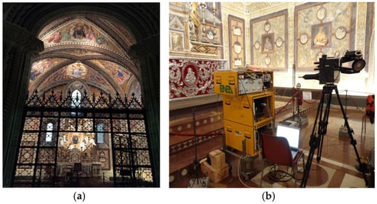 The Saint Brizio Chapel in the Orvieto Cathedral (Viterbo, Italy). (a) Picture of the Chapel from the outside shot with a Canon camera, (b) the RGB-ITR system working inside the Chapel (Photo: S. Ceccarelli).