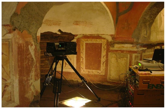 The Greek Chapel inside the Priscilla Catacombs in Rome (Italy): photographic images of the RGB-ITR system during the scan (Photo: S. Ceccarelli).