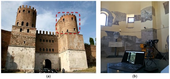 (a) Saint Sebastian monumental gate, which is part of the Aurelian Wall and the location of the Walls Museum in Rome (Italy). The red dashed square indicates the digitalized tower room; (b) detail of the interiors of the right tower with the RGB-ITR in working position. (Photo: S. Ceccarelli).