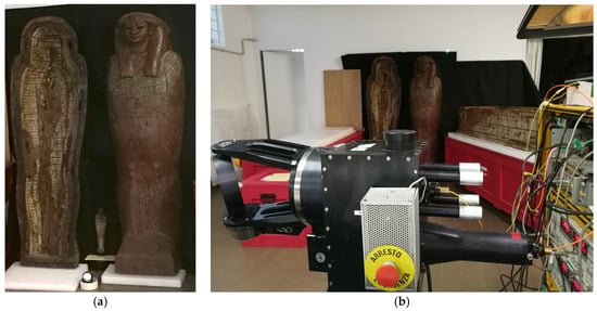 Digitalization of Egyptian wooden sarcophagus of Peftjauyauyaset: (a) the artefact in one of the three positions during the scan. The decorations are clearly evident both internally and externally, where also incisions characterize the artefact; (b) acquisition conditions with the RGB-ITR laser scanner. (Photo: S. Ceccarelli).