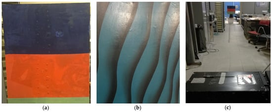 Due to its very prototypal status, the IR scanner was tested in a laboratory environment on two painted samples. The first canvas (Figure 8a) presents three bands (blue, orange and light green) made with watercolor. From a naked-eye observation, an underlying drawing can be noticed although the different elements are not clearly visible. The second canvas (Figure 8b) has a wave motif, with a color gradient from black to greenish. The materials are acrylics, but from the direct observation of the work, the painting technique is not evident. The laboratory experiment (Figure 8c) was carried out, illuminating with IR-ITR scanner one canvas at a time at two different distances (at 10 m (Figure 8a) and at 5 m (Figure 8b)), in order to compare the quality of the results at a different distance range. By using a Thorlabs detector card [47], the IR laser beam was visualized on the canvas and the scanning area was defined through the ScanSystem software.