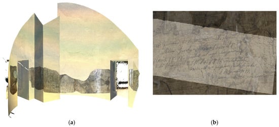 Tower room of the Saint Sebastian Gate: (a) image of part of the 3D model of the room; (b) detail of background removal elaboration for the reconstruction of inscriptions’ contents [48]. (Elaboration carried out by ENEA team with the custom software itrAnalyzer).