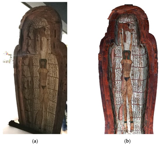 The Egyptian anthropoid sarcophagus of Peftjauyauyaset (Figure 7a) belongs to the XXVI dynasty (7th–6th century BC) and is precious evidence of crafting skills of the Late Period of ancient Egypt.