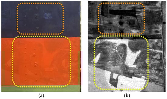 IR-ITR experiment: (a) photographic image of an acrylic-colored canvas (Photo: S. Ceccarelli); (b) IR-ITR image where the lines and shades are different from the visible image, revealing changes from the original drawing and the realization technique (dashed shapes indicate the different elements in relation to the visible image), (Elaboration carried out by ENEA team with the custom software itrAnalyzer).