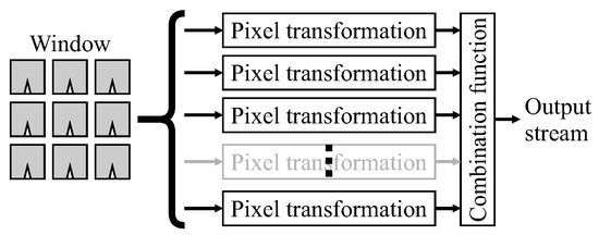 Although the filter function could be any function of the pixel values within the window, many useful filter functions can be represented as a transformation of each individual window pixel value, followed by a combination function which combines the transformed window pixels to produce a single output pixel value, as represented in Figure 2. Any filter which has an associative combination function can be restructured from direct form into a transpose form by [2]: