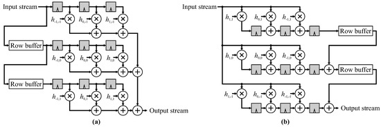 where and are the input and output images respectively, with a convolution kernel, . The pixel transformation is multiplication of each window pixel by the corresponding filter coefficient, , and the combination function is addition. Figure 3 shows the direct form 3 × 3 FIR filter restructured into its transpose form. Please note that reversing the computation order flips the filter coefficients relative to the direct form.