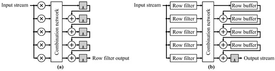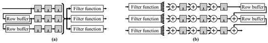 When processed using a field programmable gate array (FPGA), pipelined stream processing is the most common processing mode for implementing image filters [1]. Commonly, one pixel is processed per clock cycle (although this can be relatively easily generalized to two or more pixels per clock cycle [1]). To avoid memory bandwidth issues associated with reading all the input pixels for each window position, row buffers are typically used to cache pixels from previous image rows. Feeding the pixel stream through the window is equivalent to scanning the window through the image. Two commonly used window filter structures (ignoring image borders) are shown in Figure 1. The parallel structure shifts the window pixels in parallel with the row buffers, whereas the series structure uses the window pixels to extend the row buffers. When considering border handling, the parallel structure has the advantage that it decouples the vertical scanning (handled by the row buffers) from the horizontal scanning. These filter structures are direct form, where the window is formed directly, followed by the filter function.