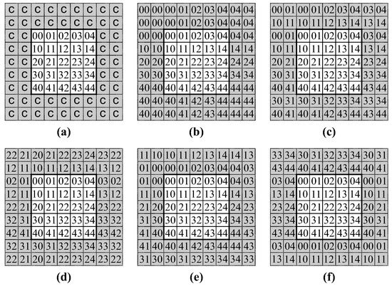 Image border extrapolation schemes (shaded pixels are extrapolated). (a): constant extension; (b): duplication; (c): two-phase duplication. (d): mirroring; (e): mirroring with duplication; (f): periodic extension.