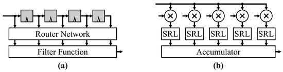 - Benkrid, A.; Benkrid, K.; Crookes, D. A novel FIR filter architecture for efficient signal boundary handling on Xilinx VIRTEX FPGAs. In Proceedings of the 11th Annual IEEE Symposium on Field-Programmable Custom Computing Machines (FCCM 2003), Napa, CA, USA, 9–11 April 2003; pp. 273–275. [Google Scholar] [CrossRef]