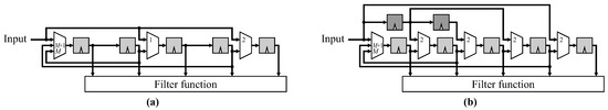 Please note that the number of additional combination functions (additions in the case of FIR filters) and associated multiplexers is given by the number of shaded entries in Figure 9 and grows quadratically with the window size W (W is assumed odd here):