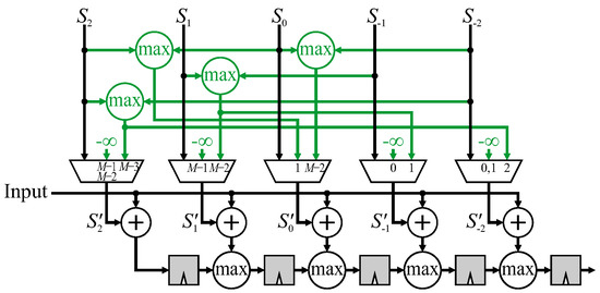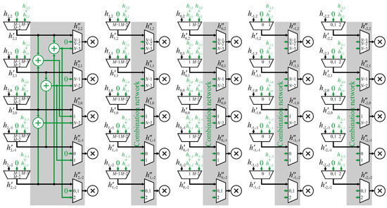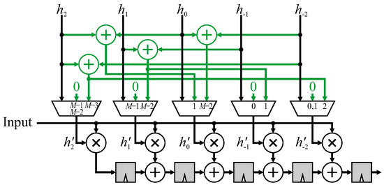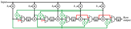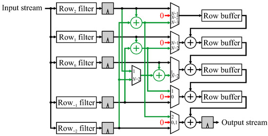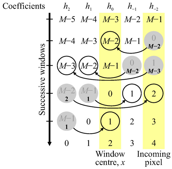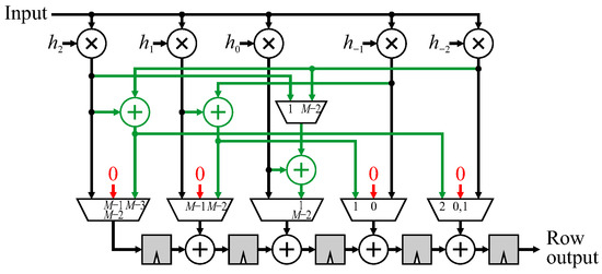 A 5 × 5 FIR filter using mirroring without duplication will be used to illustrate the method. Again, the parallel filter structure is used for separability, and the construction in Figure 9 is used to develop the modifications. Each arrow indicates where a transformed pixel needs to be combined into a different place within the output chain. Consider the window centered at . The window extension is (shown in grey) which is multiplied by . To arrive at the output at the correct time, the product must be added with the regular contribution from pixel (shown by the circle), which is the center of the window. Since this combination is added only during clock cycle , a multiplexer is required. All 6 window extensions are shown in green in Figure 12.