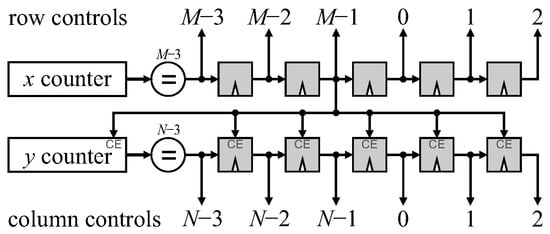 In the proposed architectures, the multiplexers are controlled by the timing associated with the incoming pixel stream. This timing can easily be provided by a horizontal column (x) counter (modulo M) and a vertical row (y) counter (modulo N), which are reset by the corresponding stream synchronization signals. Rather than explicitly decode each of the required states, it is more efficient to decode the earliest state during a transition at an image border, and use a shift register to decode the subsequent states, as demonstrated in Figure 19. For the row counter and state shift register, providing a clock enable signal from the last column () minimizes the additional circuitry required. (If the rows and columns are extended separately, then the clock enable can be shifted to a later tap to account for the latency of the row filters).