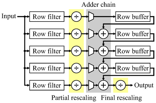 One practical issue with implementing FIR filters is that the coefficients are usually scaled to enable integer arithmetic to be used. Where possible, the scale factor is a power of 2 (effectively representing the coefficients as binary fixed point), so the output of the filter can be obtained simply by bit-shifting (free in hardware). Rescaling is usually the last operation within the filter to minimize the precision loss through the adder chain. One implication of this is that the word length is larger on the output of the multipliers. In particular, this affects the word length (hence memory size) of the row buffers, which for transpose filters must be sized according to the adder chain rather than the filter input. The buffer word length may be reduced by distributing the rescaling (as illustrated in Figure 20), with a partial rescaling of the outputs of the row filters, and the balance applied at the final filter output. The output can be rounded by adding in the scaled equivalent of 0.5 at the start of the chain.