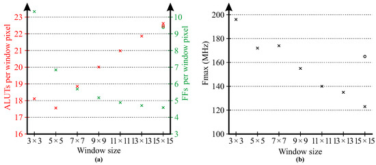 (a): resources required per window pixel; (b): maximum clock frequency. Pipelined results for the 15 × 15 window are shown with ∘.