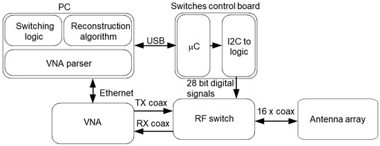 A block diagram of the developed prototype is shown in Figure 1. It is composed of a vector network analyzer (VNA), a radio frequency (RF) switch matrix connected to a set of ad-hoc antennas ( antennas are adopted in the current prototype), and a control board used to drive the switches. The whole system is managed by a personal computer (PC), which is used to select the active antenna pair (via universal serial bus (USB) connection), control the VNA, collect the measurements (via an Ethernet connection), and execute the reconstruction algorithms. The PC also takes care of the synchronization between the various components of the system.