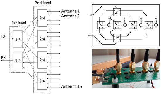 The RF switch matrix is composed of two levels, as shown in Figure 2. The first one, which is directly connected to the transmit and receive ports of the VNA, is composed of two 1:4 switch boards, whereas the second one is composed of four 2:4 switch boards, whose outputs are connected to the 16 antennas. For both of the levels, Peregrine Semiconductor’s PE42441 SP4T absorptive RF switches have been used in the switch boards. The working frequency band of such components ranges from 10 MHz up to 8 GHz. Each board has been manufactured using a Rogers RO4350B substrate (characterized by complex relative dielectric permittivity at 2.5 GHz) in order to reduce the RF signal attenuation and the changes in the electrical parameters. The switching subsystem allows for independently selecting a pair of antennas among the possible 240 combinations. One antenna at a time is used in transmit mode (i.e., it is connected to the transmitting (TX) port of the VNA), whereas the remaining ones are sequentially connected to the receiving port of the VNA for measuring the field scattered by the target. In order to reduce the interferences in the measurement, all of the inactive antennas are terminated using absorptive RF switch components, ensuring an isolation between the adjacent channels at the board connectors of about 90 dB at 3 GHz. The switch control board is equipped with an ATmega328 microcontroller programmed to transparently pass the USB data to an I2C bus, which is connected to four 16-bit PCF8575CDBE4 input/output (I/O) expanders used to drive the RF switches.