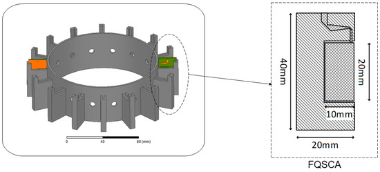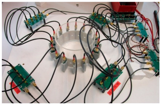 Folded quasi self-complementary antennas (FQSCA) [32] have been used in the prototype (whose layout is represented in Figure 3). Such antennas have been specifically developed in order to work in direct contact with the SUT, by reducing the reflections due to the mismatch with the target interface and optimizing the radiation inside the inspected structure. The operating bandwidth of the antennas ranges from 1.5 GHz up to 6 GHz. The radiating elements are kept in contact with the SUT using a custom 3D printed circular holding structure (shown in Figure 3) made of plastic (VeroWhite), with relative dielectric permittivity and loss tangent at 2.4 GHz [33]. The holding structure has been produced using a stereolithographical process. The separation between the two adjacent antennas is 22.5° and the radius is 60 mm. In order to compensate for the different paths of the signal in the function of the selected antenna pairs, a calibration is performed. In particular, the calibration procedure is aimed at compensating the influence (i.e., phase shift and attenuation) of the switching electronics and cables for each pair of transmitting/receiving (TX/RX) antennas, thus resulting in measurements referenced to the antenna connectors. Actually, such a calibration is performed by subtracting from the amplitude (in decibel) and phase of the measured data (with and without inclusions) of each TX/RX pair the corresponding through measurements obtained by connecting together the RX and TX antenna connectors.