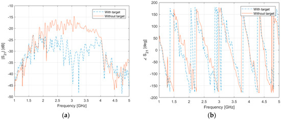 (a) Magnitude and (b) phase of the measured for a couple of facing antennas with and without the targets.